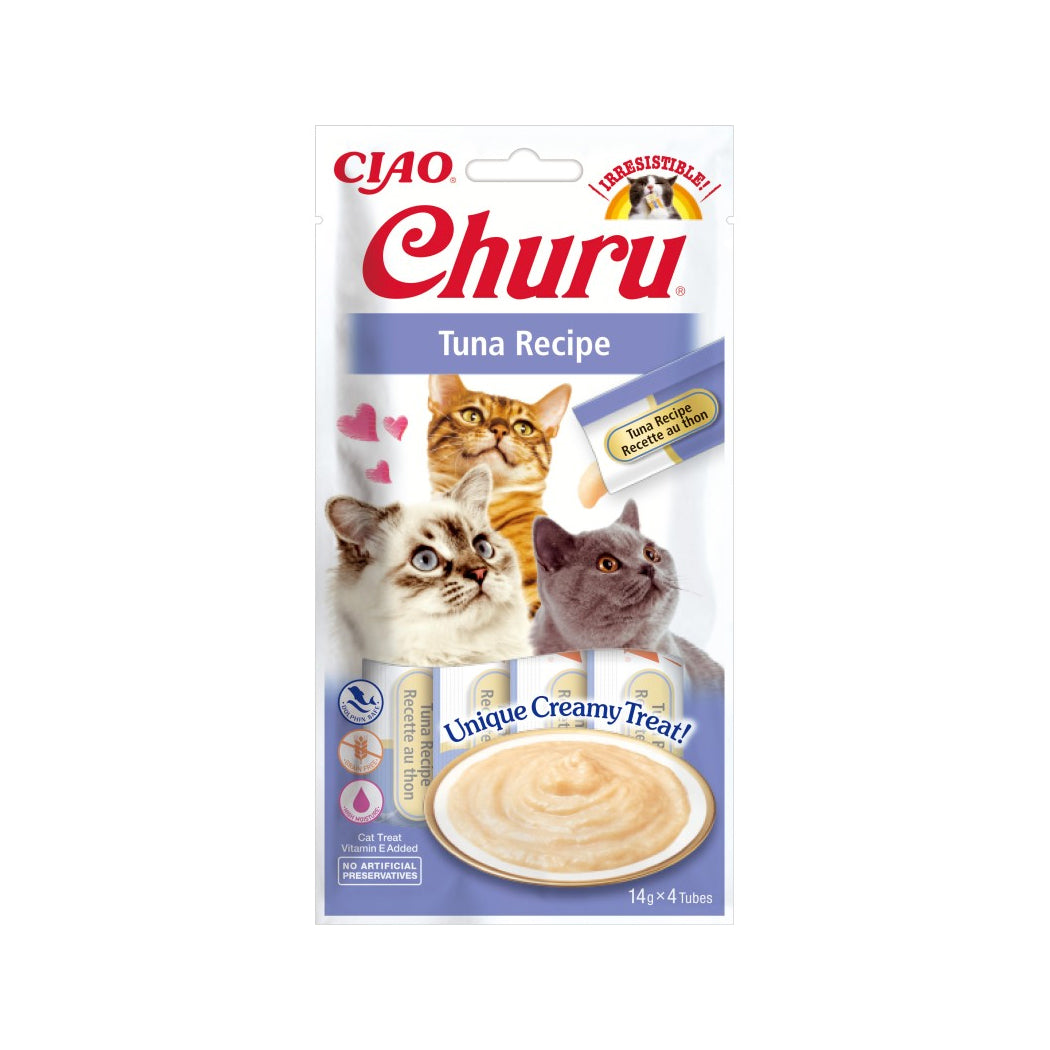 Descripción: Purés Churu, Divertidos snacks diseñados para darles de comer directamente desde el empaque a los gatos y fortalecer los lazos entre ellos y sus dueños.